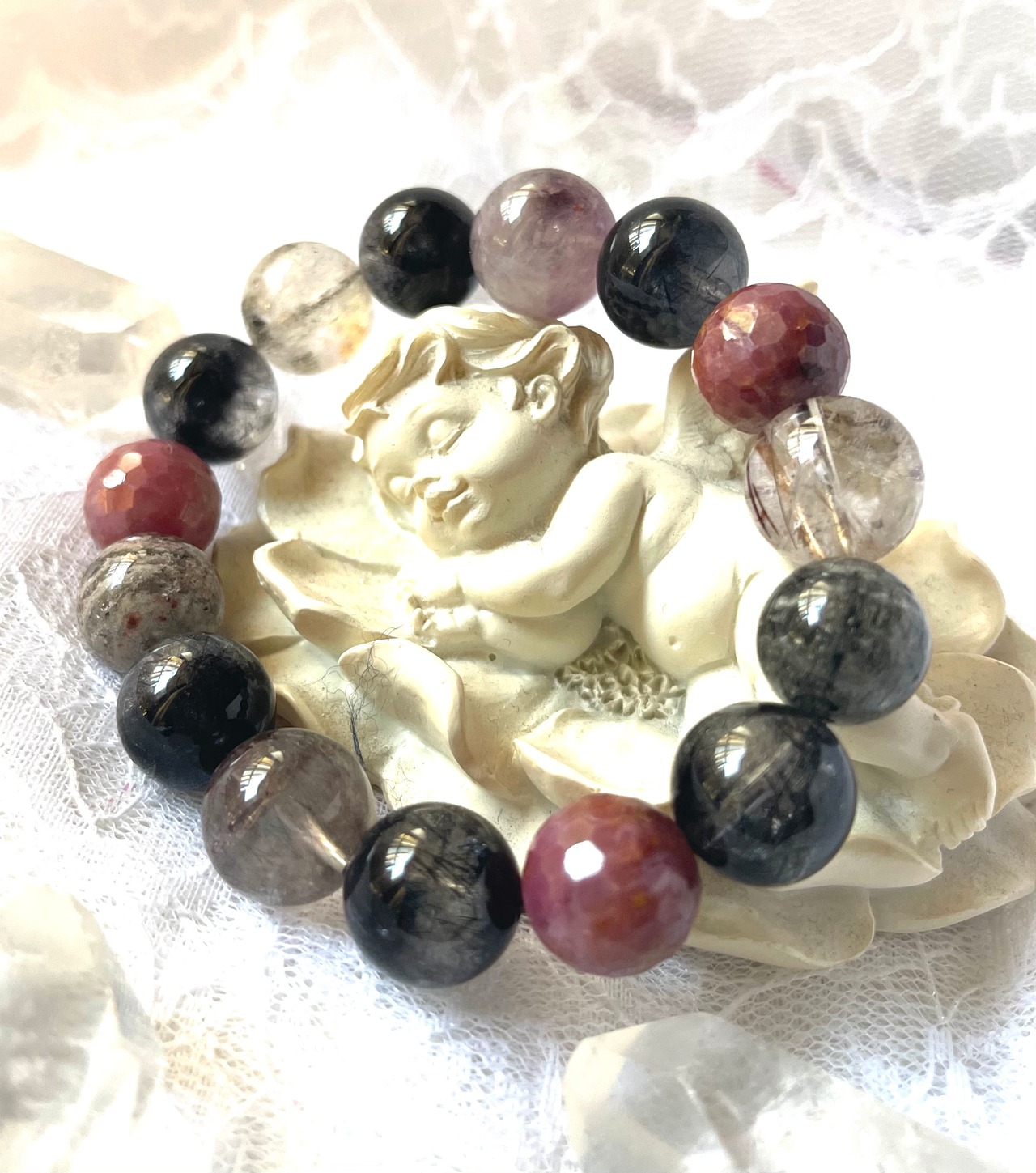 スーパーセブン、千層ガーデンクォーツ、128面カットルビー、レッドルチル、ブラックルチルを組み合わせたブレスレットです。