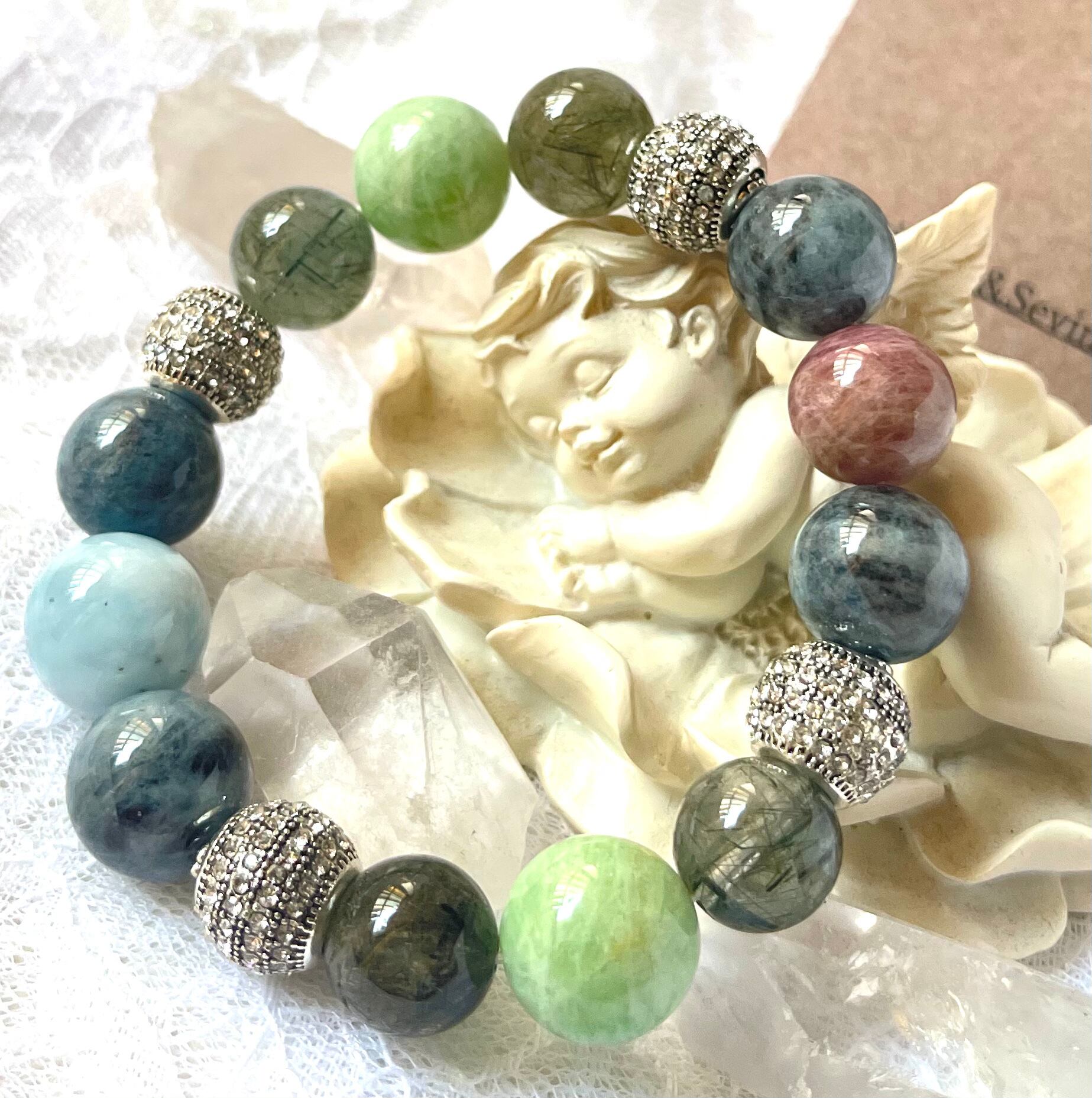 レアストーンのアクアマリンイントルマリン、ピンクトルマリン、グリーンルチル、アクアマリン、アマゾンナイトそしてシルバーボールを組み合わせたブレスレットです。