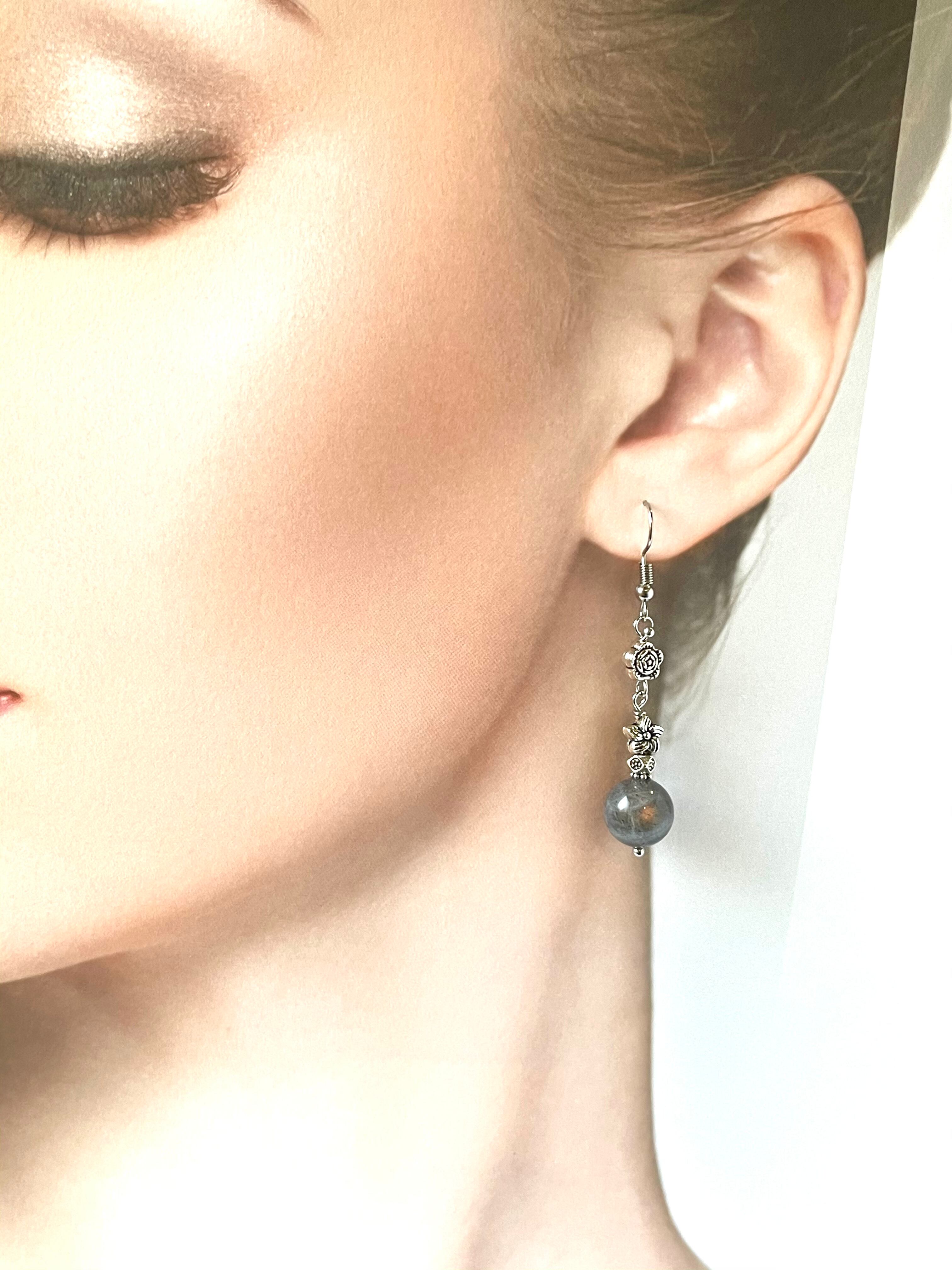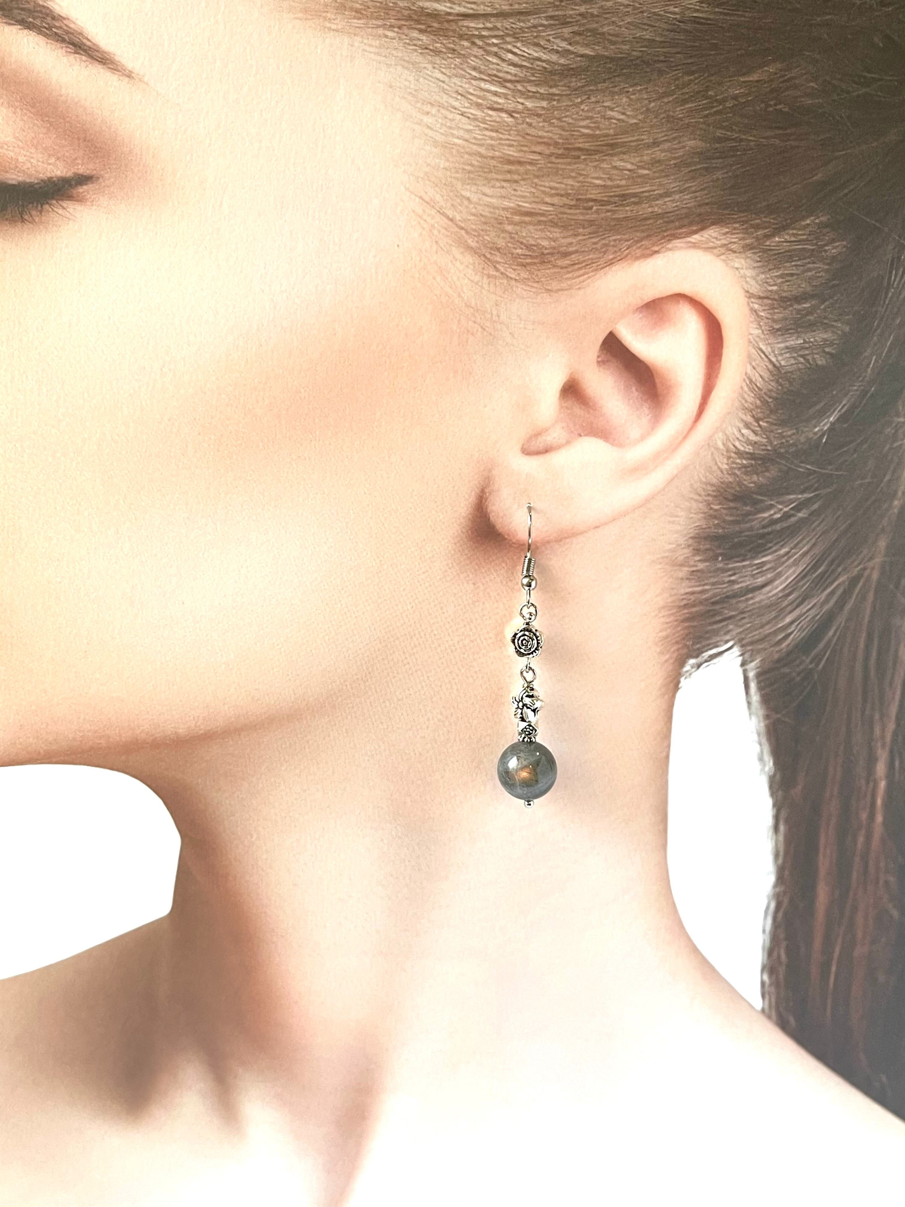 ピンクのシラーが綺麗なピンクラブラドライトにシルバーパーツを組み合わせたピアスです。
